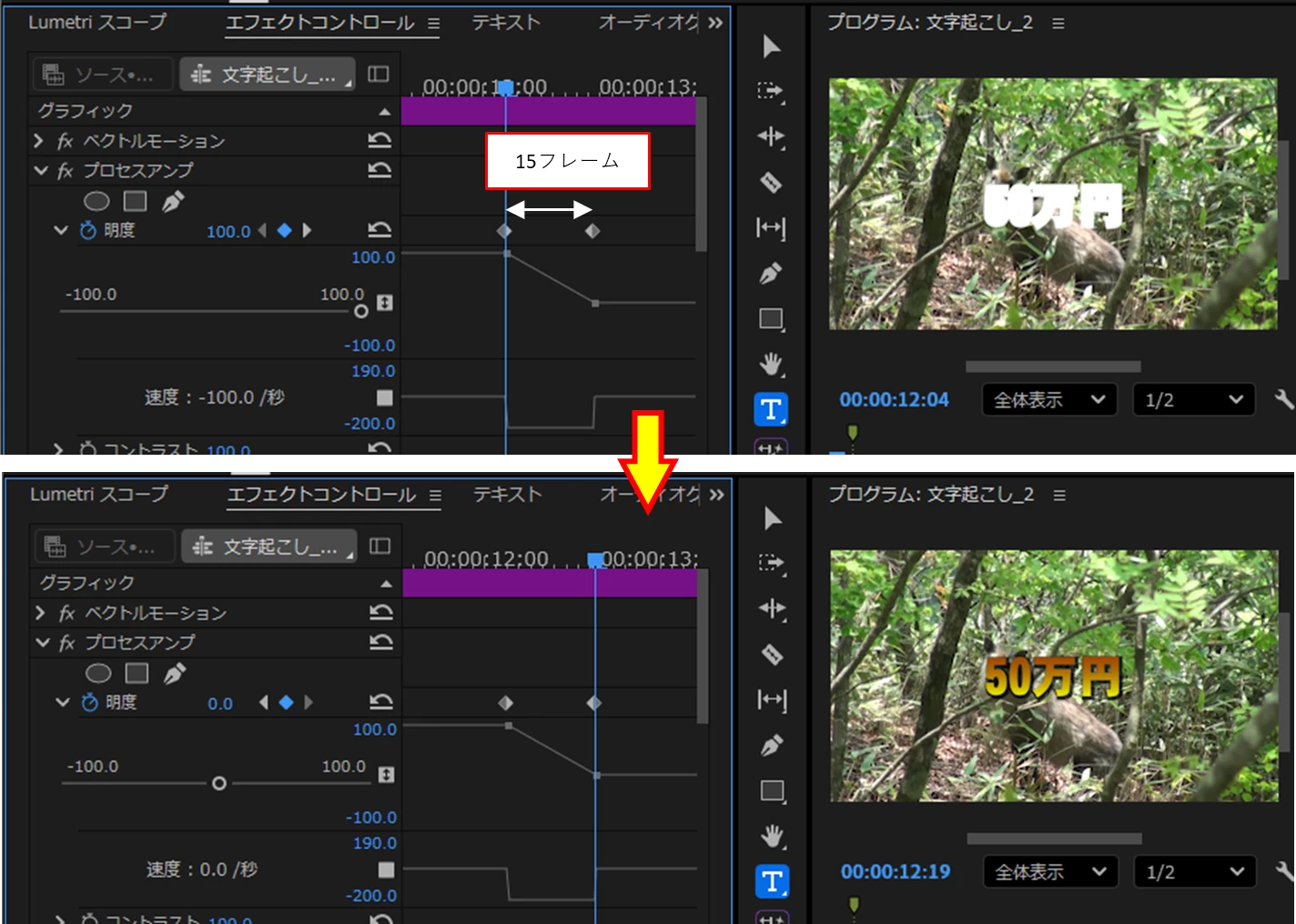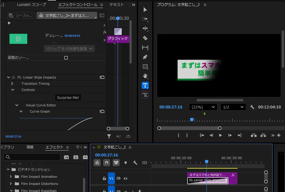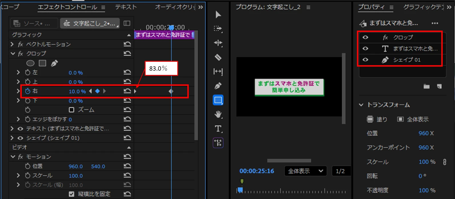 DDreamy_customer3614Known ParticipantForum|Forum|2 months agoNovember 17, 2025Questionテロップの装飾を教えてくださいForum|Forum|2 months agoNovember 17, 20253 replies154 views動画①「最短20分」のテロップが縦横比を固定のチェックを外して縦長にしています。そのうえで、エフェクトコントロールでスケールを大きくしてアニメーションにしたいのですが、縦横比のチェックを外しているのでできない状況です。この処理をした上で操作はできるのでしょうか? 動画②「50万円」の部分が光ってゆっくり消えていくエフェクトを教えて頂きたいです。 動画③①まずは~の部分が右から表示されています。このアニメーションの作成方法を教えてください。 よろしくお願いいたします。動画②.zip動画③.zip動画①.zip