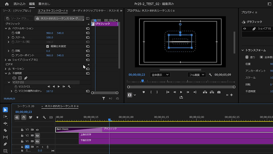「エフェクトコントロール」パネルで「シェイプ(シェイプ01)」を展開し、「トランスフォーム」の再生ヘッドを伸び開始時間に移動し、「スケール」の「縦横比を固定」のチェックを外し、「水平比率」に下図のようにキーフレームを打ちます。