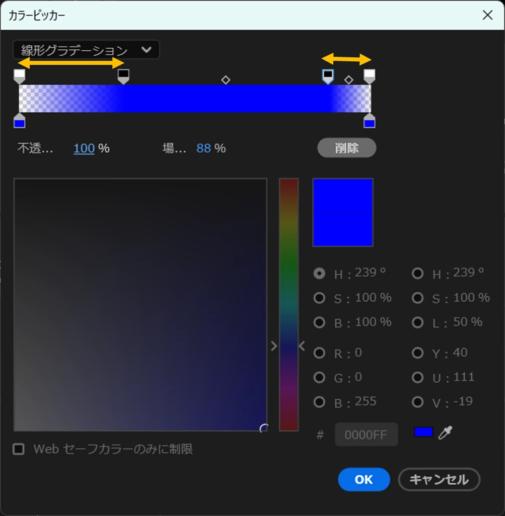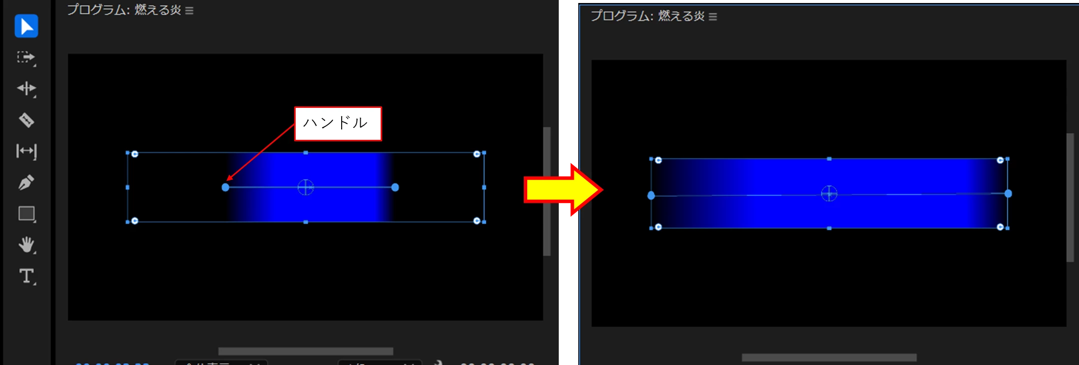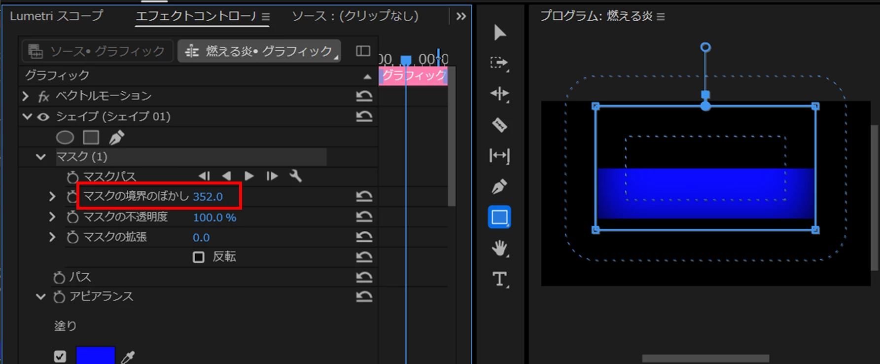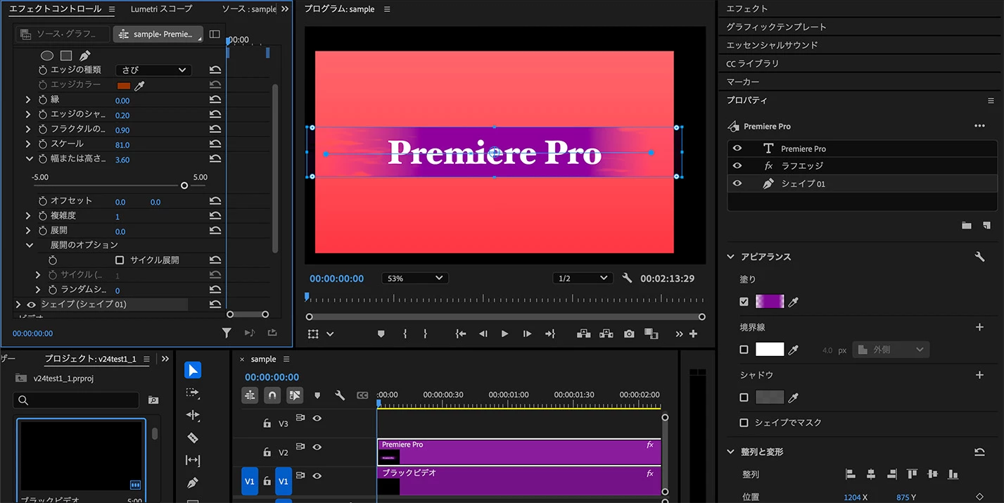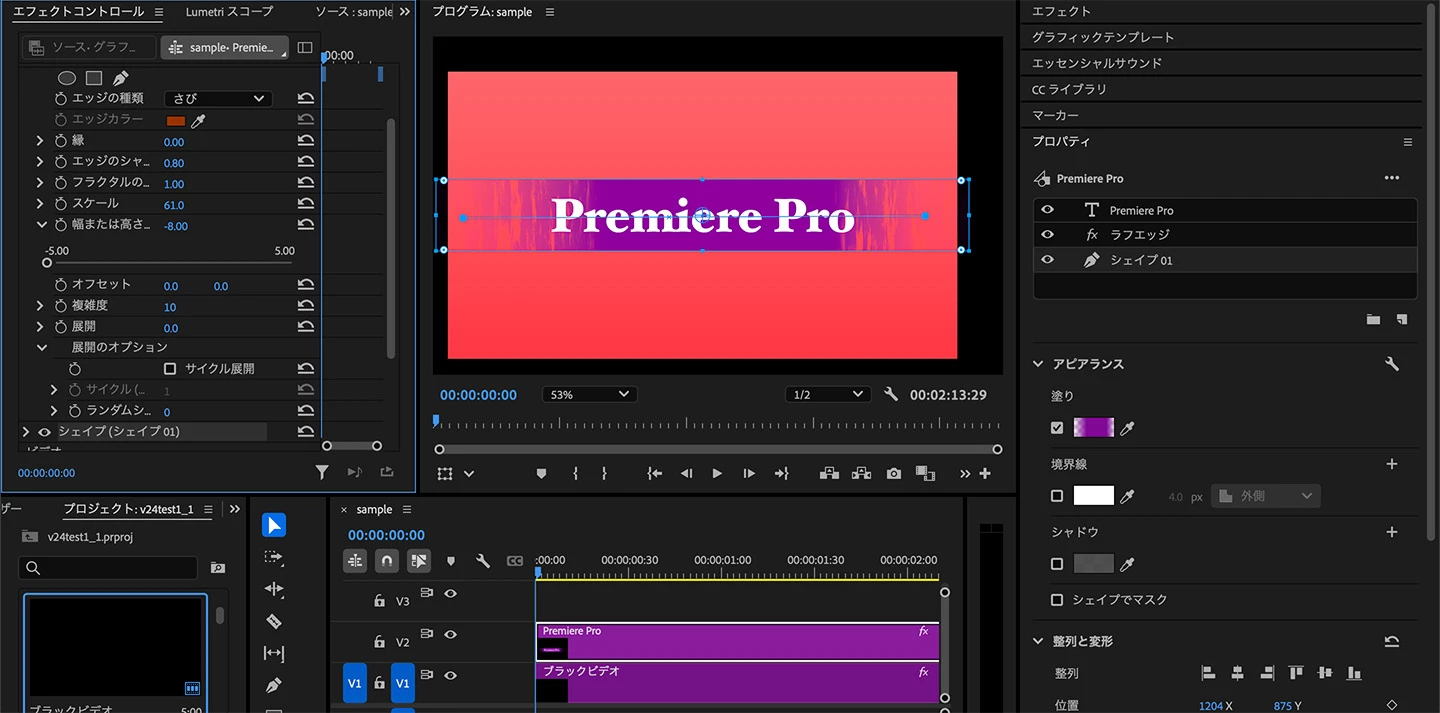 不透明度を設定したグラデーション塗りに「ラフエッジ」を適用すると下図のように左右の端を変形させることができます。