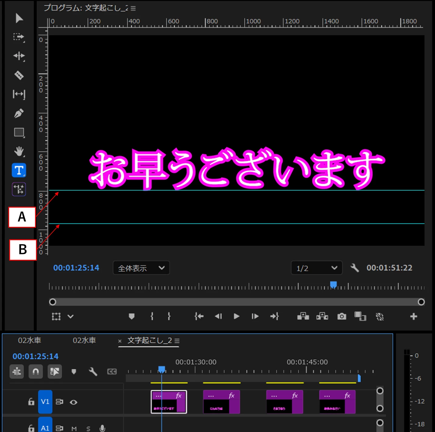複数のテロップクリップがあり、テロップの下端は上下方向「A」位置になっているとします。