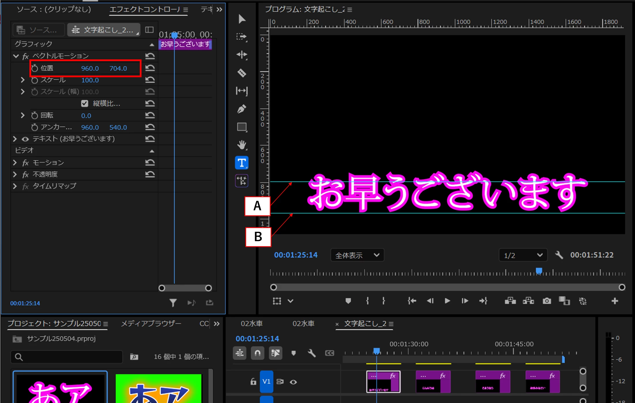 ①基準のテロップクリップを選択し(例えば左端のテロップクリップ)、「エフェクトコントロール」パネルの「ベクトルモーション」の「位置」の右側数値を大きくしてテロップ下端を「B」位置に合わせます。