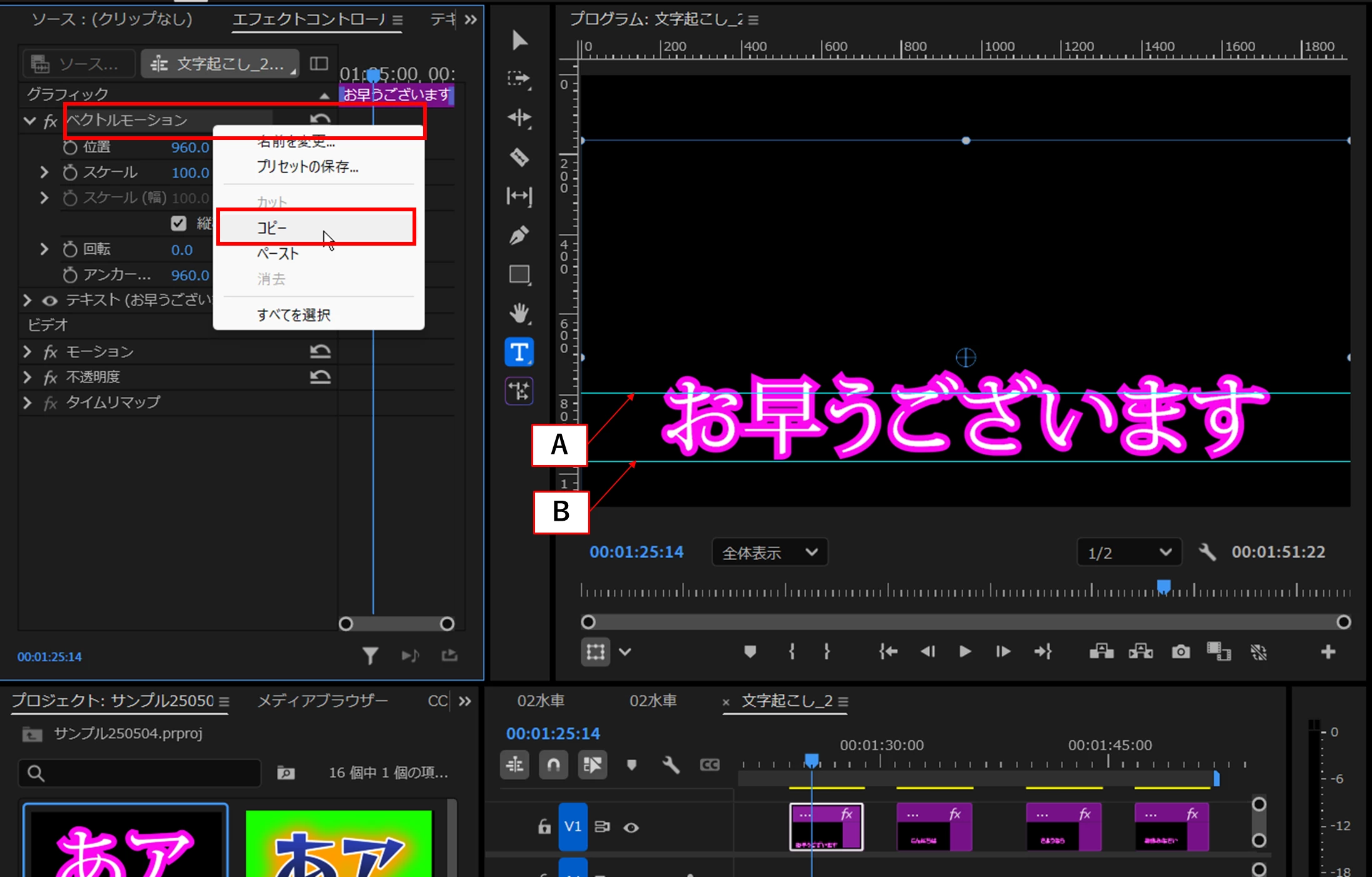 ②「ベクトルモーション」を選択し、右クリックして開いたコンテキストメニューから「コピー(Ctrl+C)」を選択します。