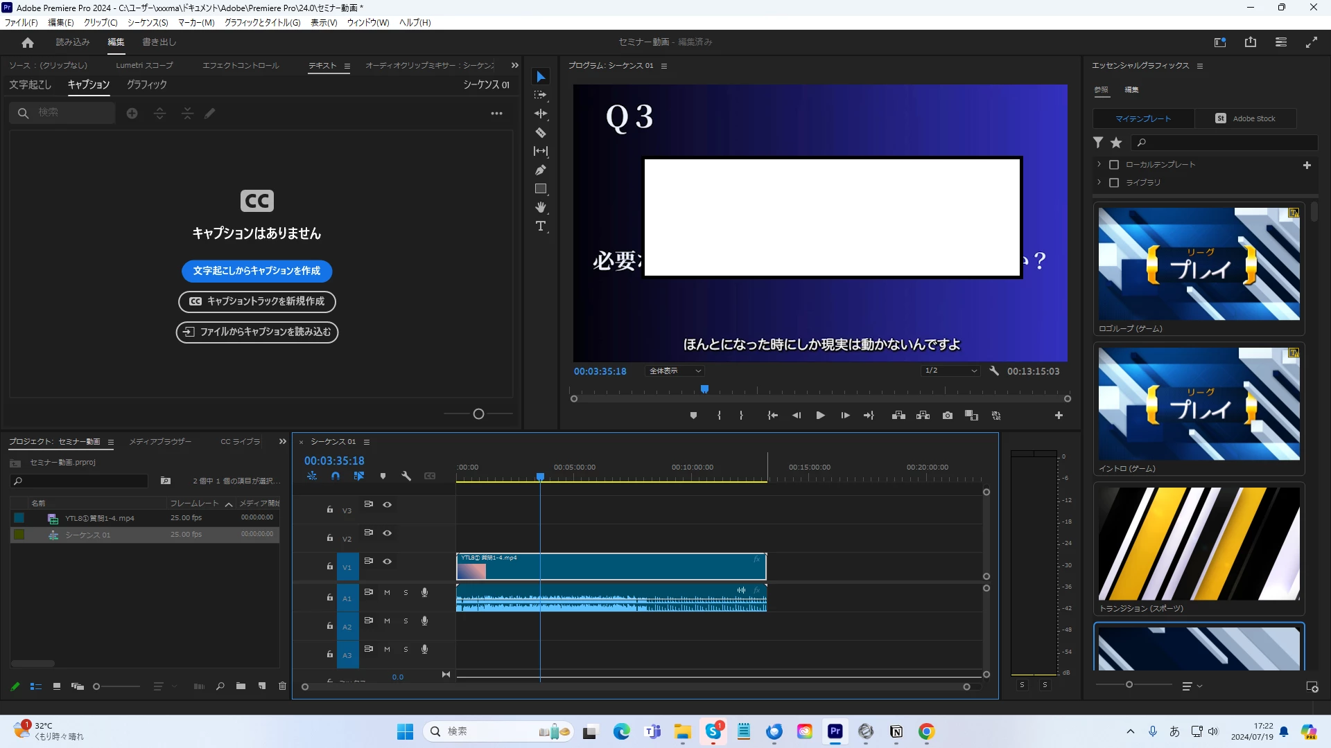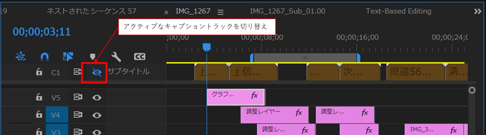 再度同じ場所に戻しましたが、素材動画とリンクしても素材には編集していたものはないため、テロップ欄は相変わらずタイムラインに出ず編集できないままです。