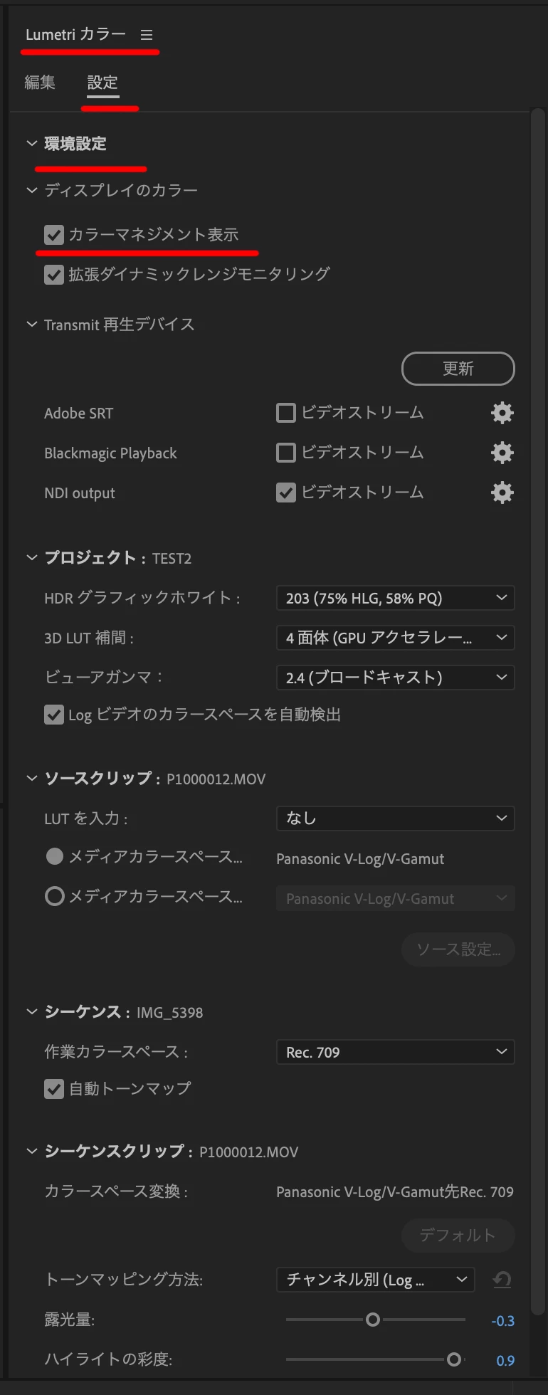 ディスプレイのカラーマネージメントの設定は、「Lumetri カラー」パネルの「設定」のタブに移動されました。