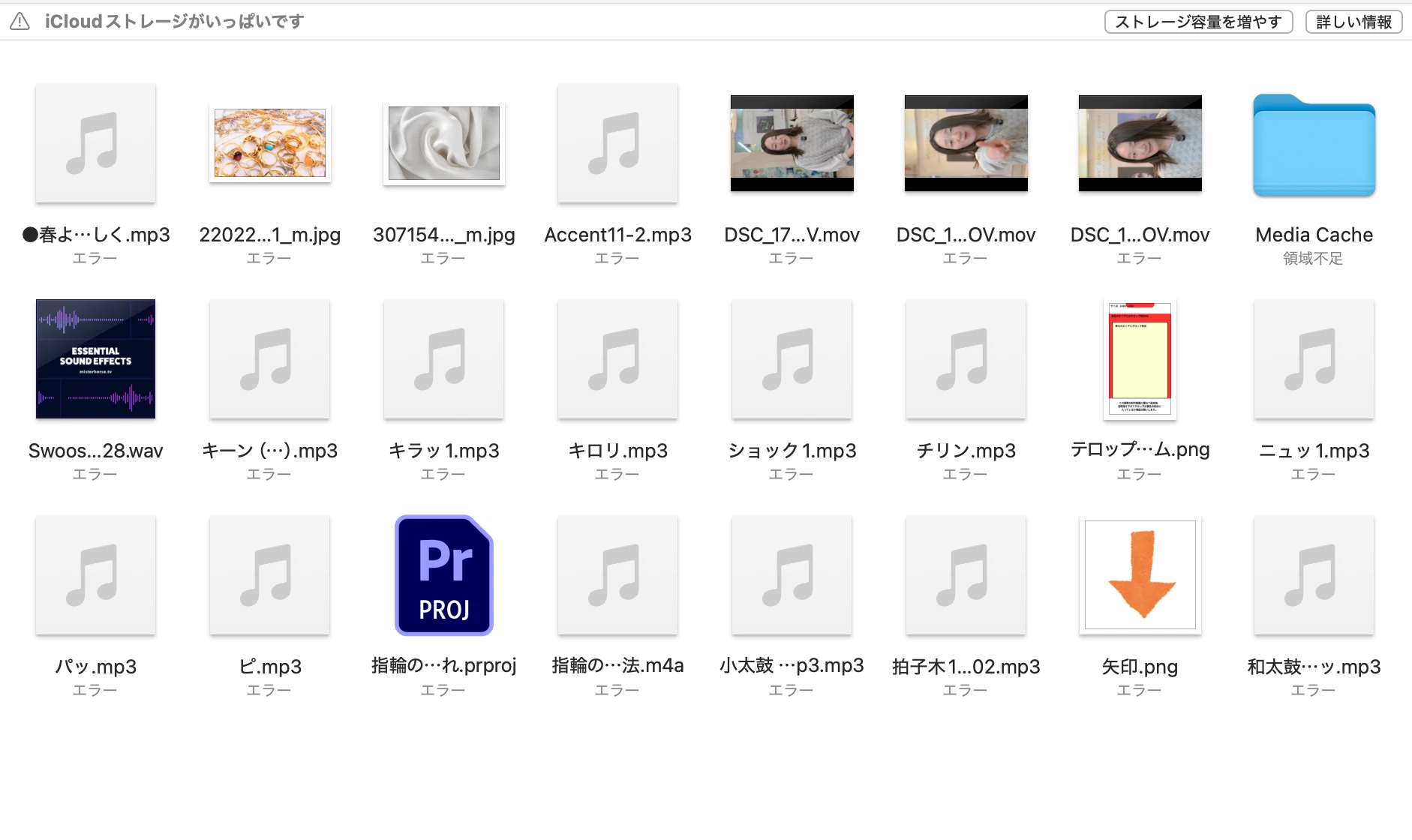 これ(iCloud側の容量不足)自体は、Premiere Proの動作には無関係かと思います。あくまでも私個人の考えですが、動画編集で用いる動画ファイルなどはサイズがとても大きく、iCloudと同期するのはあまり得策ではないようにも思います。