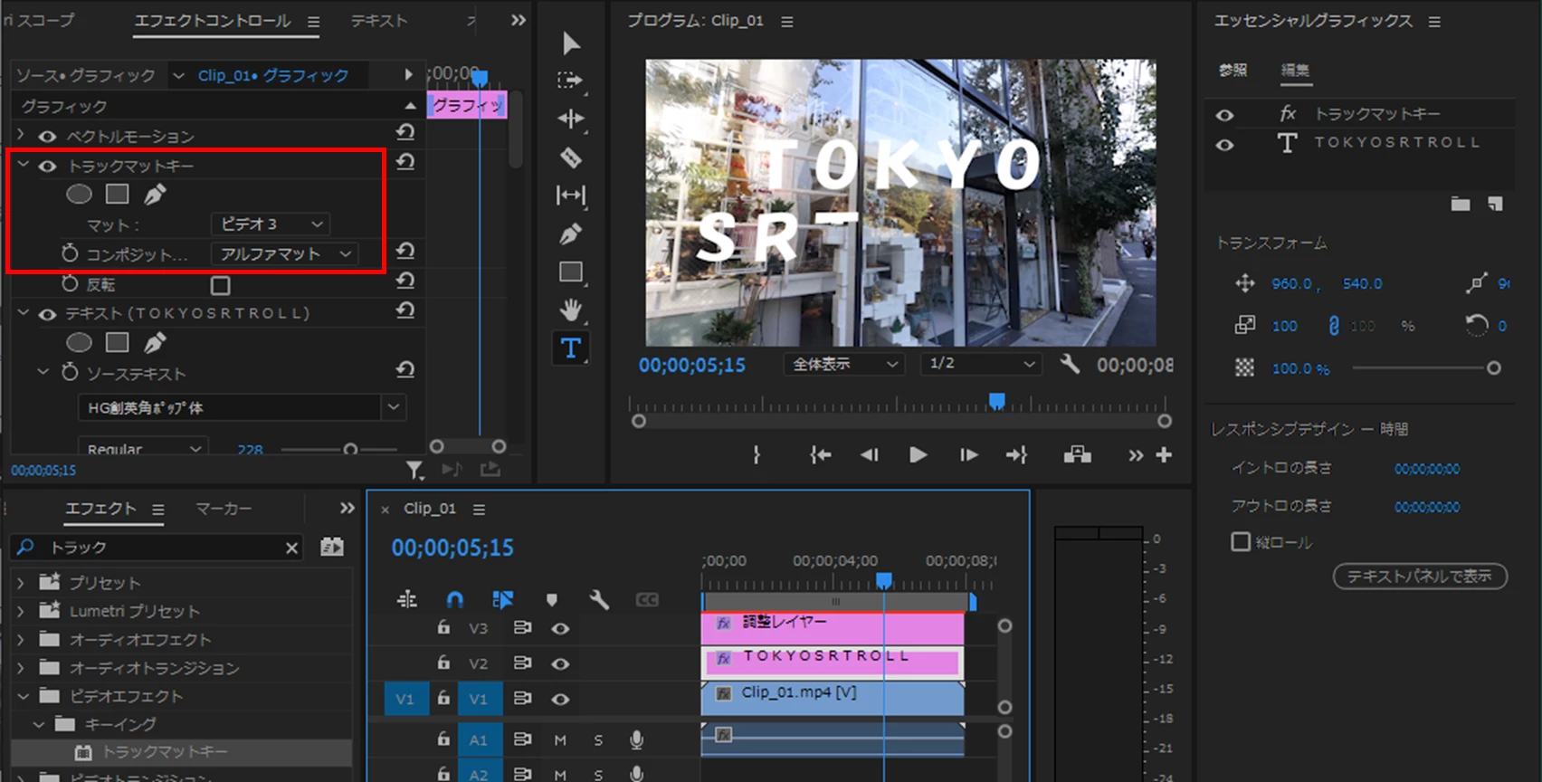 作成したのですが、どうしても最後のトラックマットキーで「ビデオ3」にすると