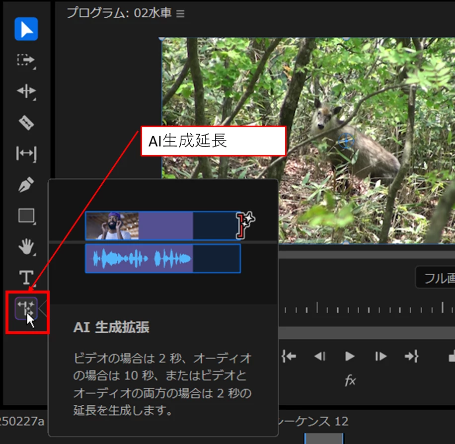 グッドタイミングで、Premiere Pro v25.2からクリップの先頭または末尾にフレームを2秒間追加できる「AI生成延長」という機能が追加されました。「AI生成延長」アイコンを選択しクリップの端を伸ばす方向にドラッグします。