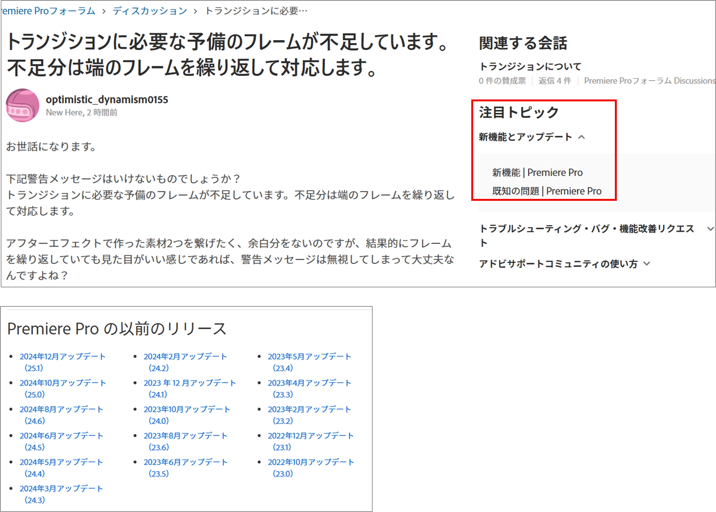 アップデートの新情報は、Premiere Proフォーラム冒頭右側の「注目トピック」⇒「新機能とアップデート」項をご覧いただくと、詳細な記載があります。