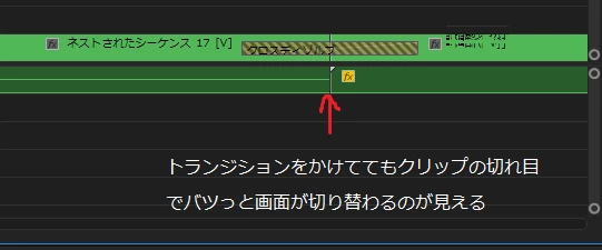 トランジションをかけてもクリップの切れ目でバツッと切り替わるのが見える
