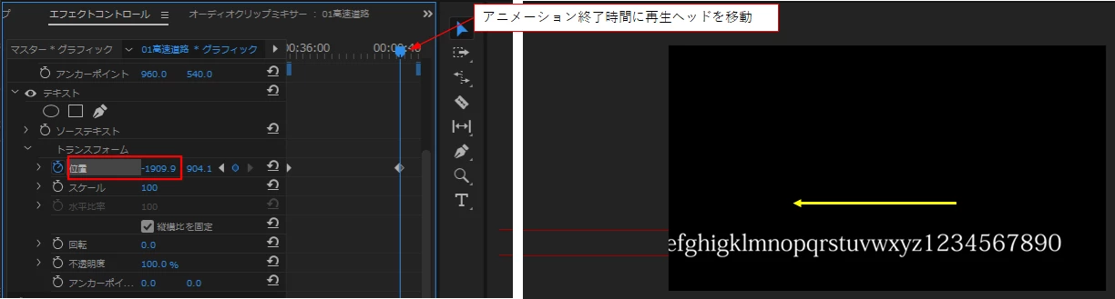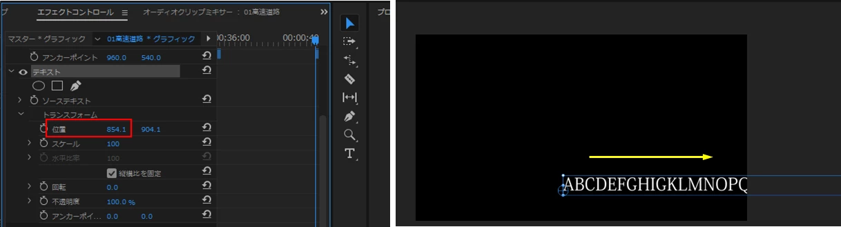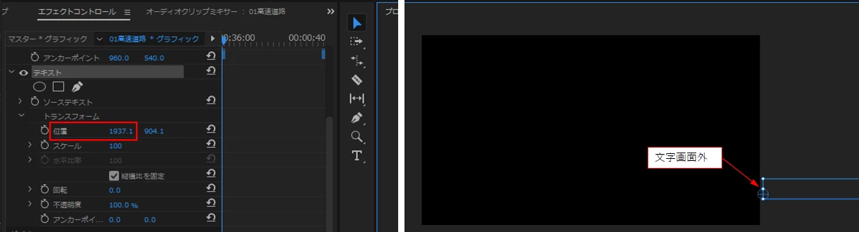 アニメーションのオンを押す(キーフレームを打つ)と、画面外に溢れていたテロップが消えてしまいます。