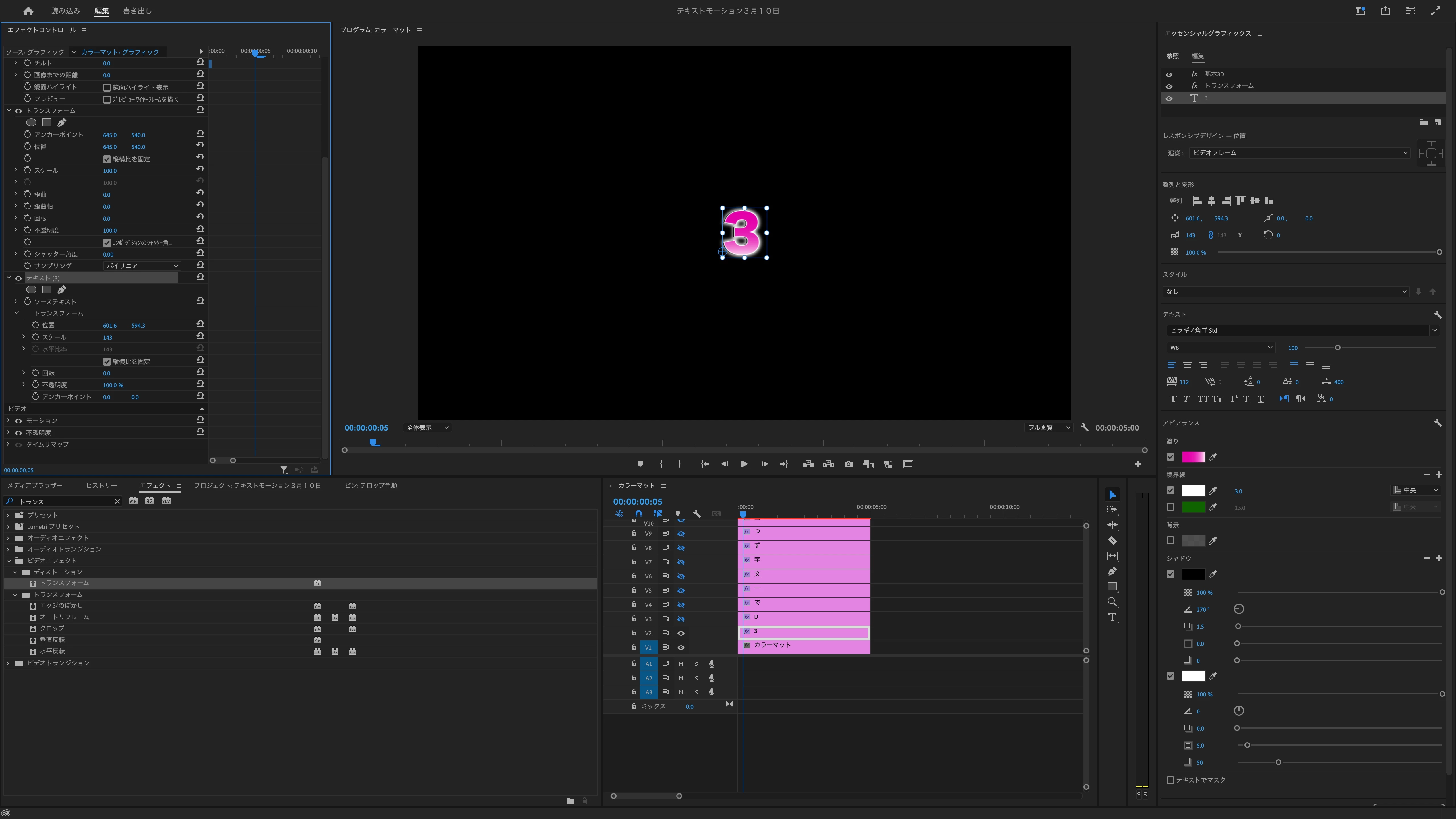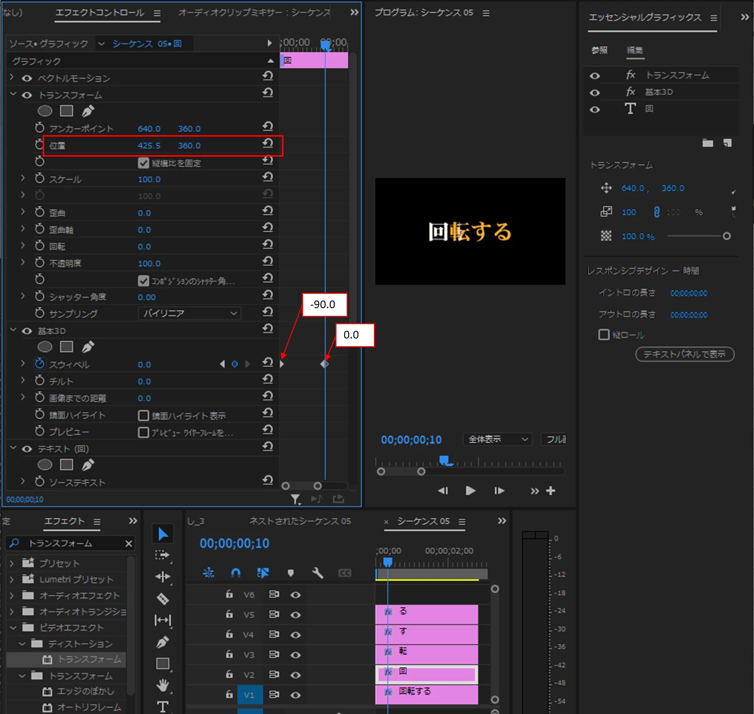 リンクを貼らせて頂いた動画の『一文字ずつ回転する』を作成しているのですが、4:11秒のトランスフォームで、テキストの位置を移動させたかったのですが、テキストを選択し、トランスフォームの位置を移動させても、左と、上方向には何故かアンカーポイントのみが移動し、テキストが表示されておらず移動が出来ません。 なにが原因なのでしょうか。