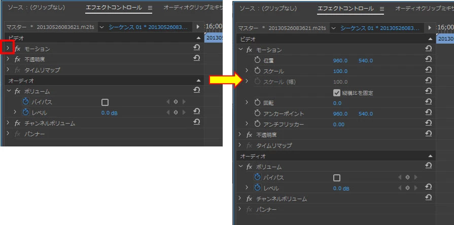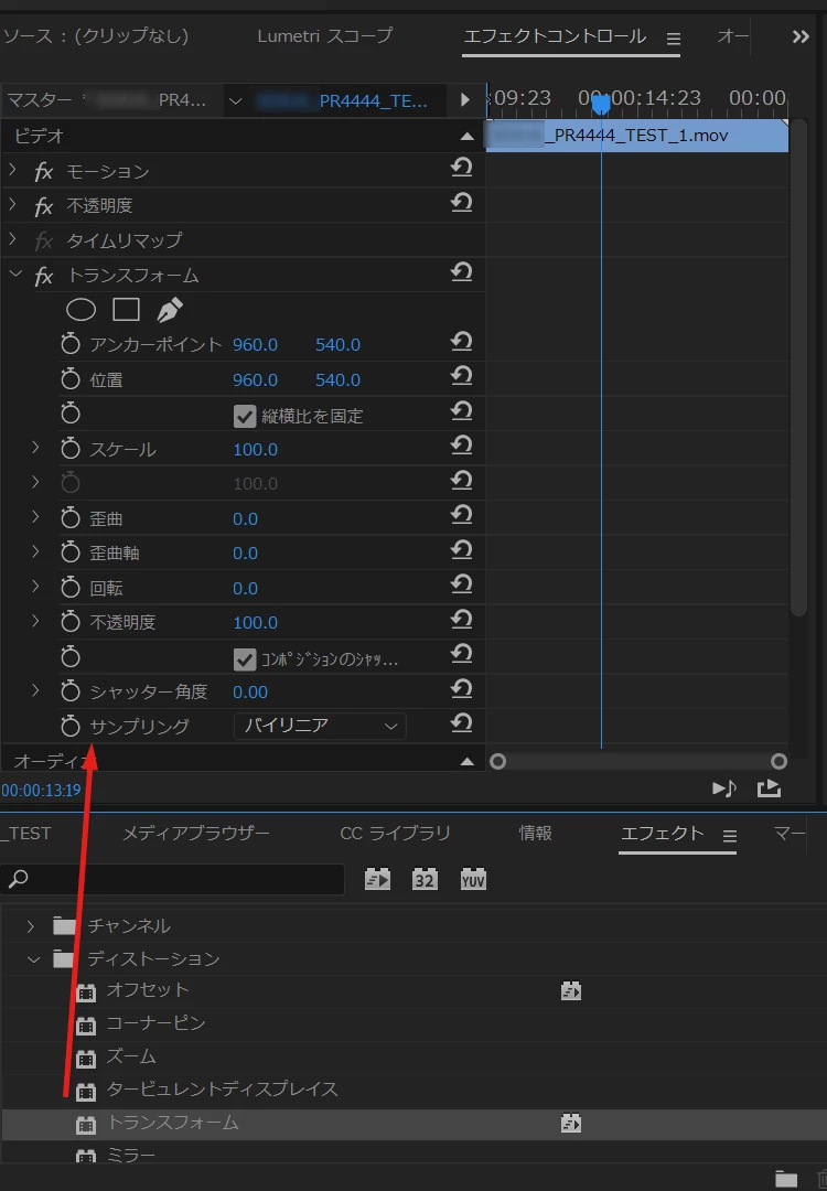 先日プレミアプロを購入したのですが、エフェクトコントロールパネルにあるトランスフォームアイコンが表示されません。