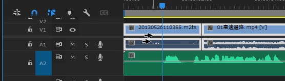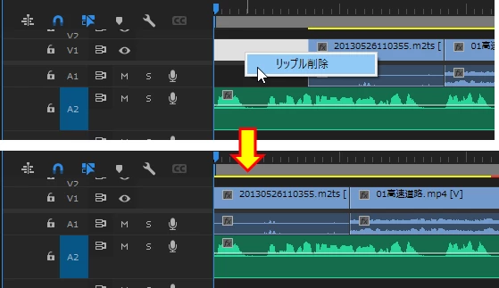 ①「トラックの前方選択ツール」をV1またはA1のクリップの上に置くと2本の矢印が表示されます。