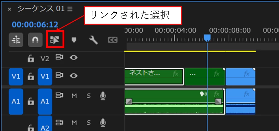 カットとエフェクトを加えたビデオとオーディオをそれぞれネストしました。その後出来上がったネストされたシークエンスをまたカットしようとしているのですが、オーディオとビデオがリンクしておらず、別々に選択されてしまいます。リンクしようとしてビデオとオーディオを全選択してリンクを選択しようとしたのですが、すでにリンクされていました。どのようにしたら、カットするときにそれぞれではなくオーディオとビデオが一緒に動いてくれますか?
