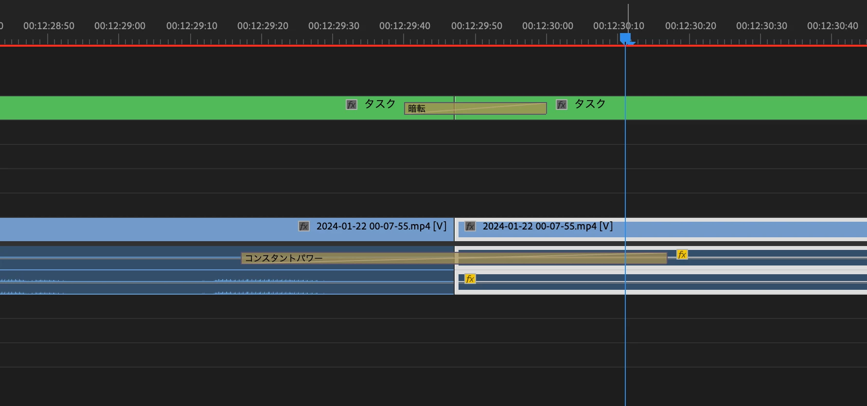 トランジションのデュレーションが30フレームの場合、予備フレームは前側クリップ、後側クリップともそれぞれ15フレーム以上必要です。