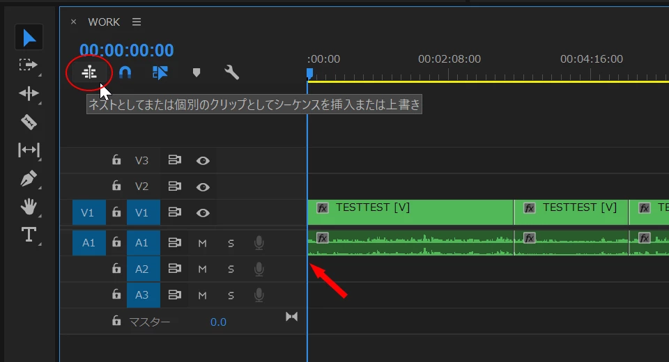 まず、添付画像をご参照いただき、赤丸で囲んだ「ネストとしてまたは個別のクリップとしてシーケンスを挿入または上書き」のアイコンが「白」の状態にします。