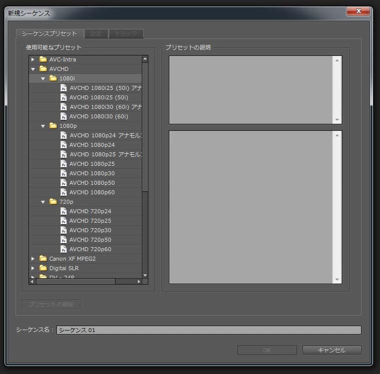 Sony AX-700 でAVCHD形式で撮影して、Premiere Pro CS5.5で編集するにあたり、新規プロジェクトを作成しようとしたら、シーケンス設定でAVCHDのどれを選択すれば良いか判りません。