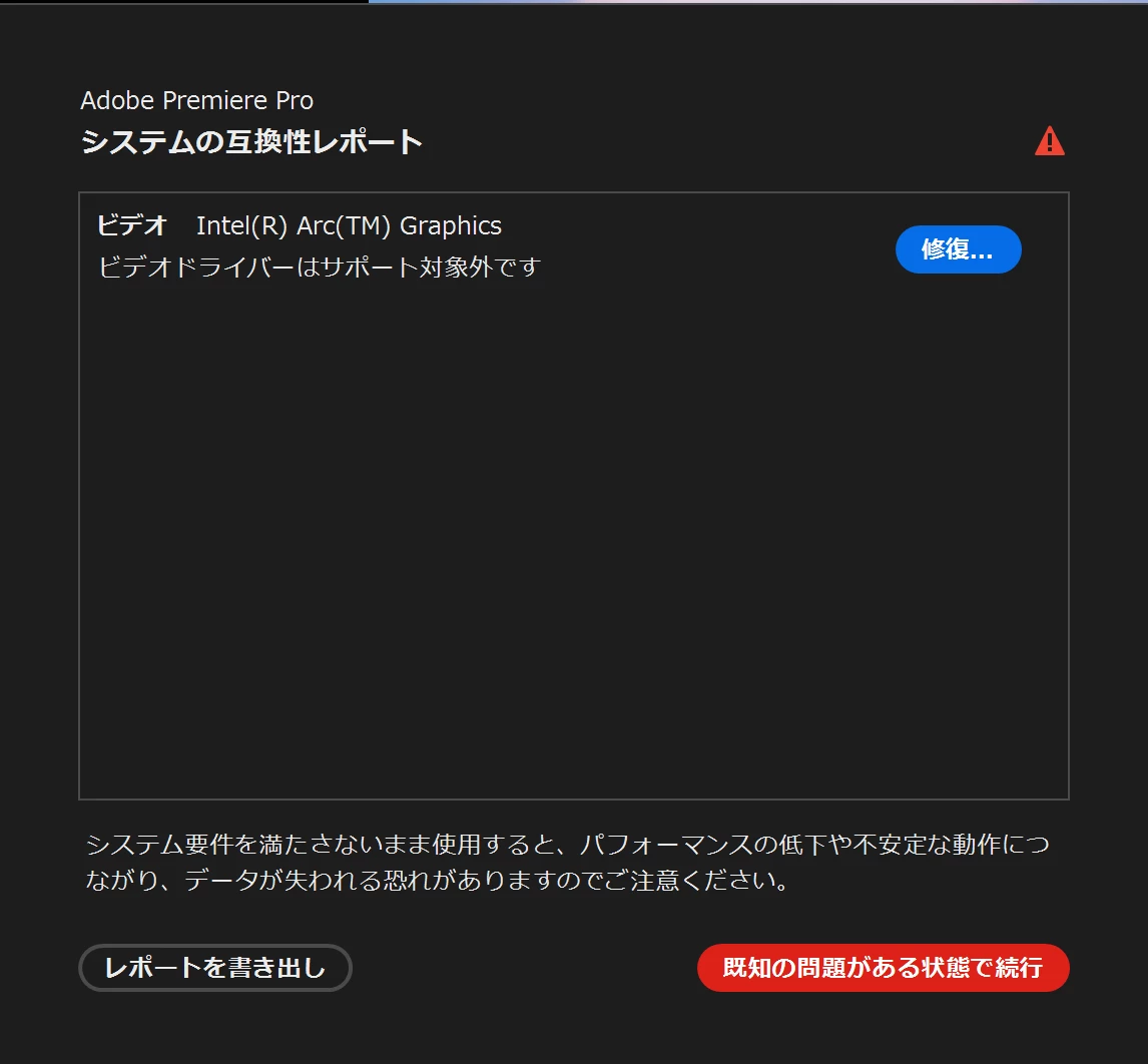 adobe Premium Pro を今日から使おうとしていたのですが、システムの互換性レポートが消えません。使用しているのはIntel(R) Core(TM) Ultra 7 155Hの内蔵GPUです。