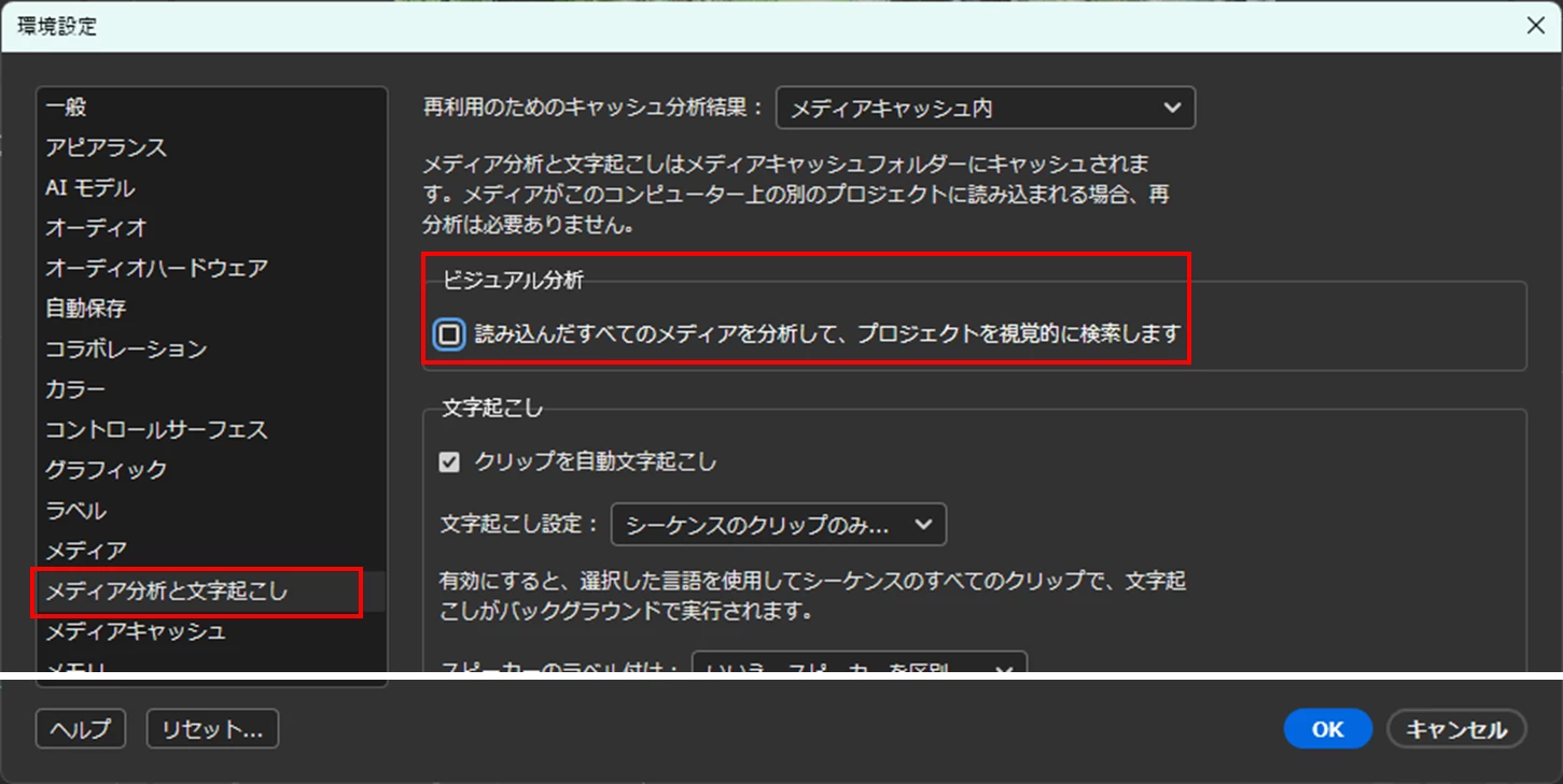 「環境設定」の「メディア分析(M)と文字起こし(T)」でペインで「ビジュアル分析」項の「読み込んだすべてのメディアを分析して、プロジェクトを視覚的に検索します」のチェックを外し、「OK」をクリックします。