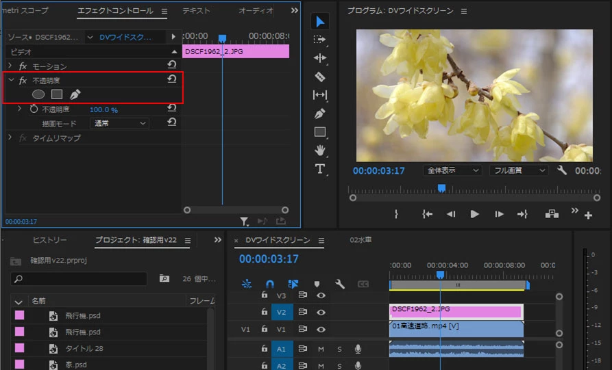 ①V1トラックに映像、V2トラックに画像を配置し、画像クリップを選択して、「エフェクトコントロール」パネルを開いて、「不透明度」を展開します。「楕円マスク」、「長方形マスク」、「ペンマスク」が表示されています。