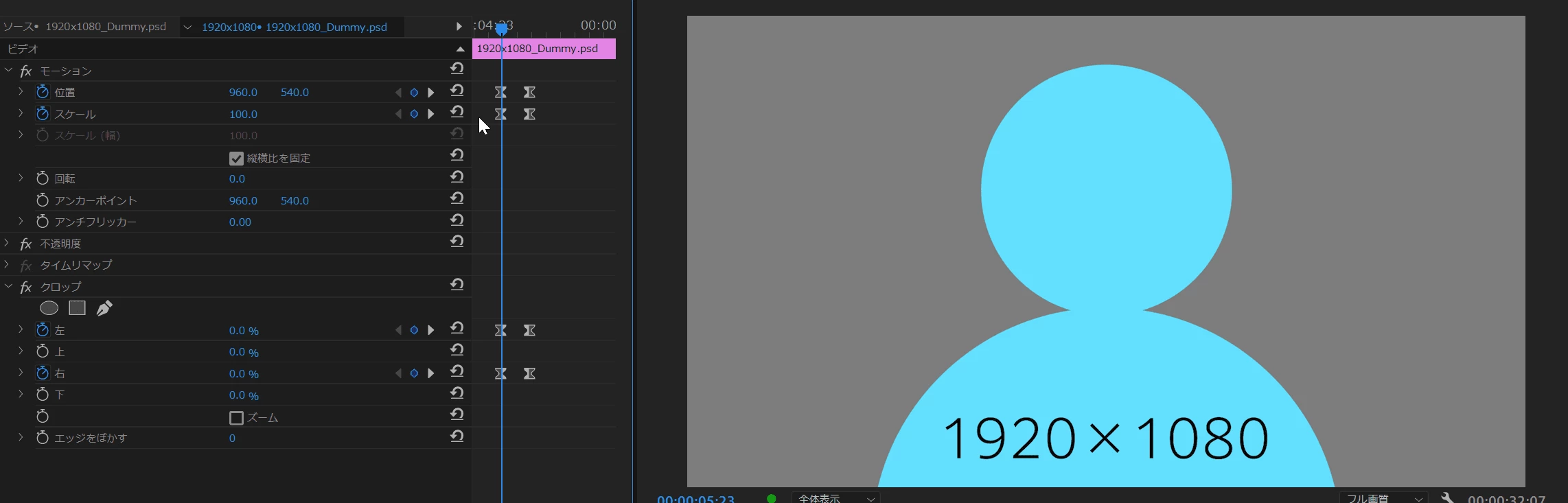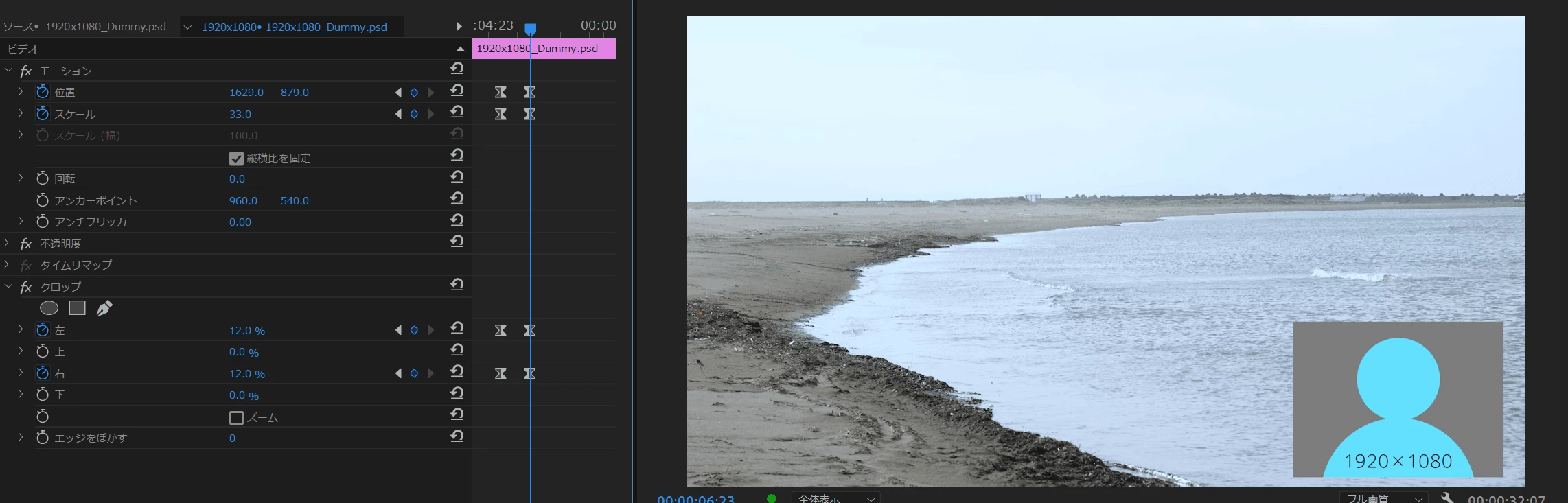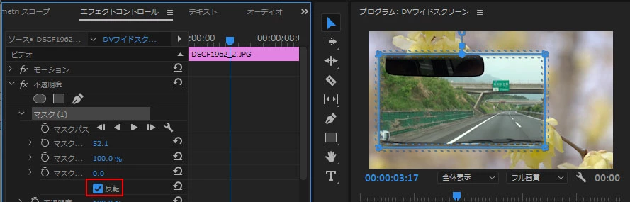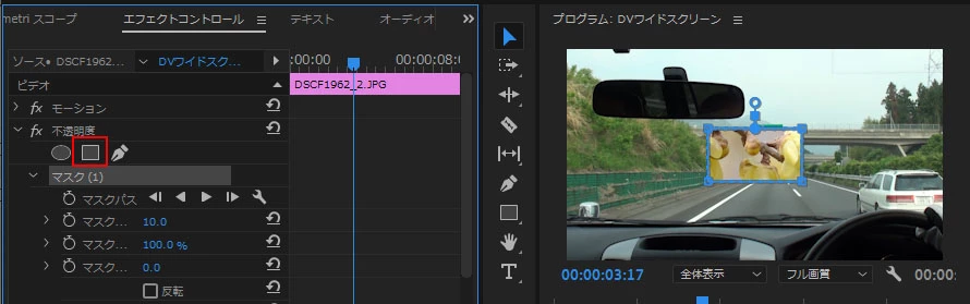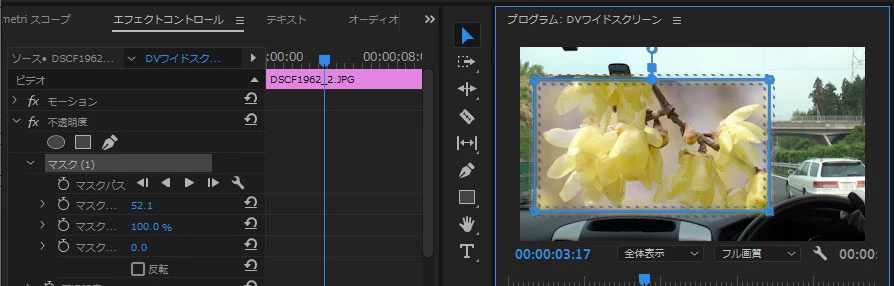 ②ここでは「長方形マスク」をクリックします。すると、「プログラムモニター」にマスクが作成され、マスク以外が切り取られます(消されます、透明になります)。