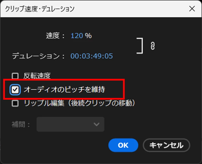 「クリップ速度・デュレーション」ウィンドウで「オーディオのピッチを維持」にチェックを入れれば、元のピッチが維持されます(下図)。