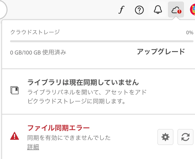creative cloudデスクトップアプリにて、「ファイル同期エラー」と表示されます。