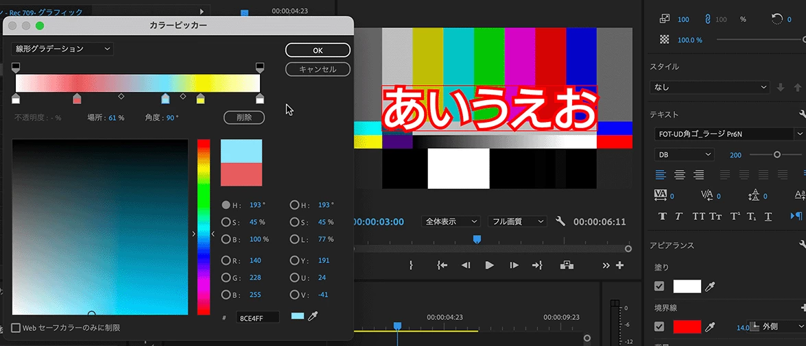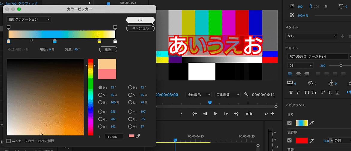 その中でフォントの色を変えようと、フォントを選択(赤枠)し虹色の色調整を行ったのですが