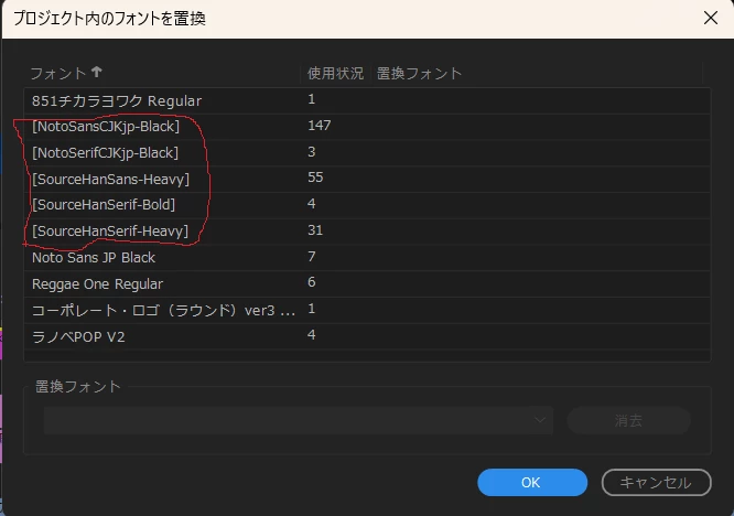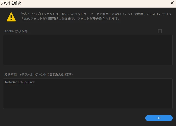 しかし、プロジェクトを開くと必ずと言っていいほど「フォントが見つかりません、代替えフォントに置き換えます」という状況になります。
