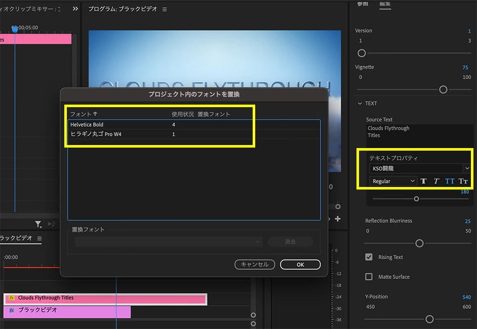と言うのも、配布されているテンプレートはAfter Effects で作成されており、Premiereの「プロジェクト内のフォントを置換」機能を利用しても、置換えられたフォントが検索できない状態になるためです。