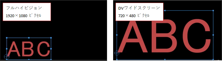 例えば、フォントサイズ400ピクセルの文字をフルハイビジョンとDVワイドスクリーンで表示した場合、下図のようになります。逆算すると、バウンディングボックスの上下方向長さがフォントサイズのようです。
