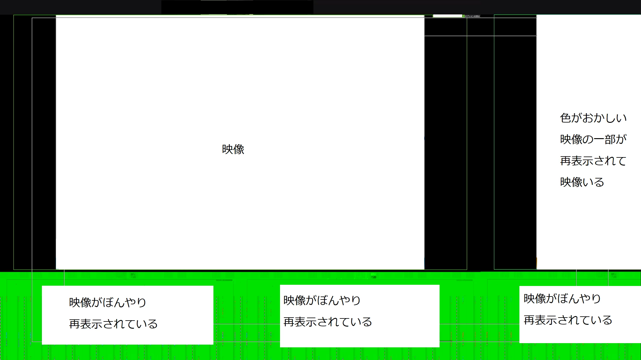 Windows 10の機能を用いてキャプチャした動画をPremiereに取り込もうとしているのですが、なぜか解像度が正しく認識されず下記加増のように緑色の帯が表示されてしまい困っています。