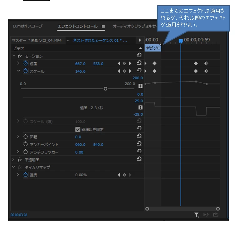 下記キャプチャにある通り、薄青色の新郎ソロと書いてある素材の長さまでしかエフェクトが効かず、それ以降のエフェクトが適用されません。このような場合の対処法を教えてください。