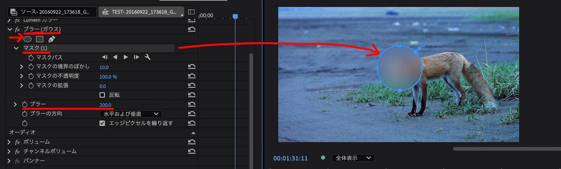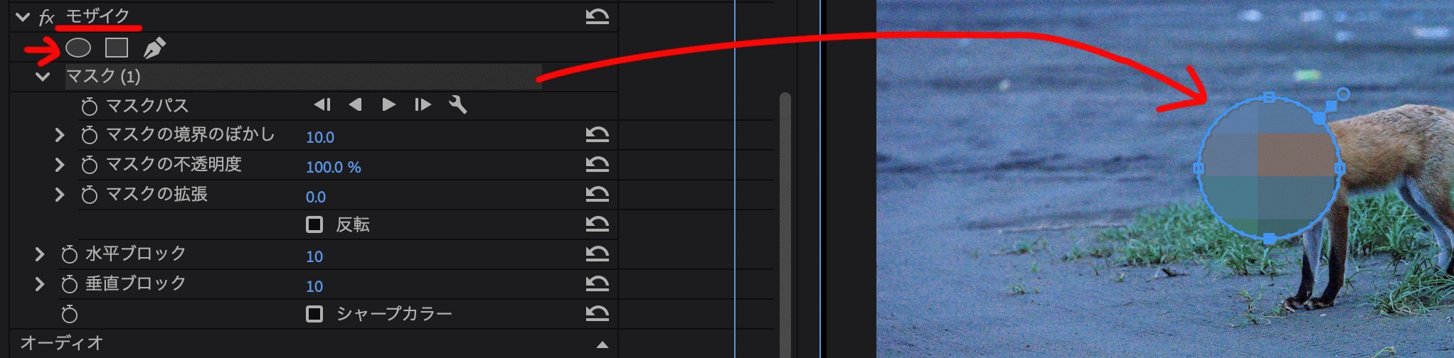 もし、「モザイク」をかけたい状況でしたら、ブラー(ガウス)の代わりにモザイクエフェクトを使い、同様に円のマスクで効果をかけたい領域をかこみます。