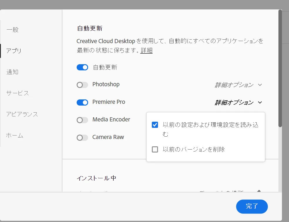 ひとまずPremiere Proの自動更新を切ろうと、Creative Cloud/自動更新を管理するを見てみると添付画像の「以前の設定および環境設定を読み込む」という項目があり、チェック後完了しましたが何も変わりません。