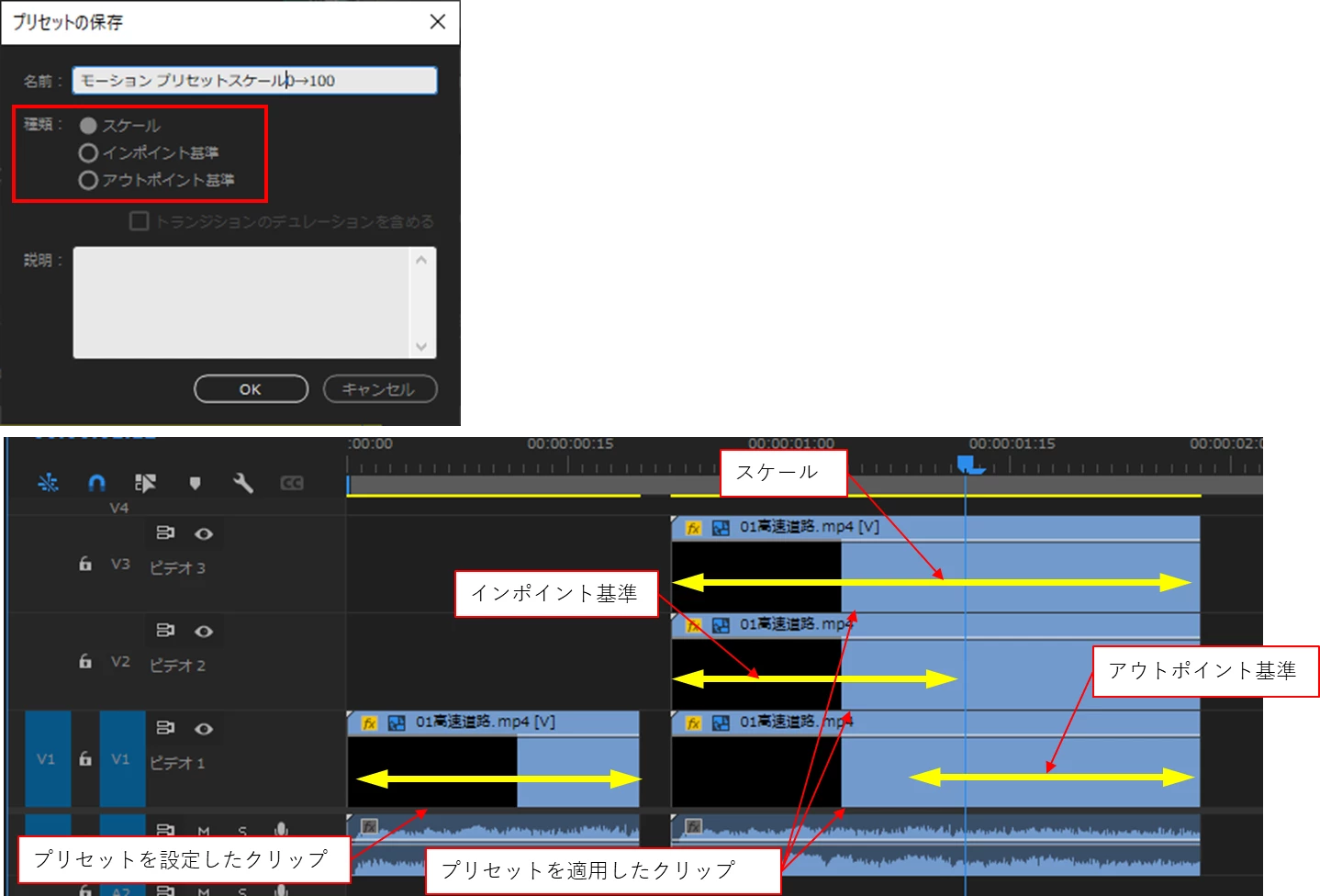 スケールを20フレームで0から100になるようにキーフレームを打ったアニメーションをプリセット化して使用したいのですが、他の素材に適用させたところ、後ろのキーフレームが20フレーム時点ではなく、はるか後方についてしまいます。