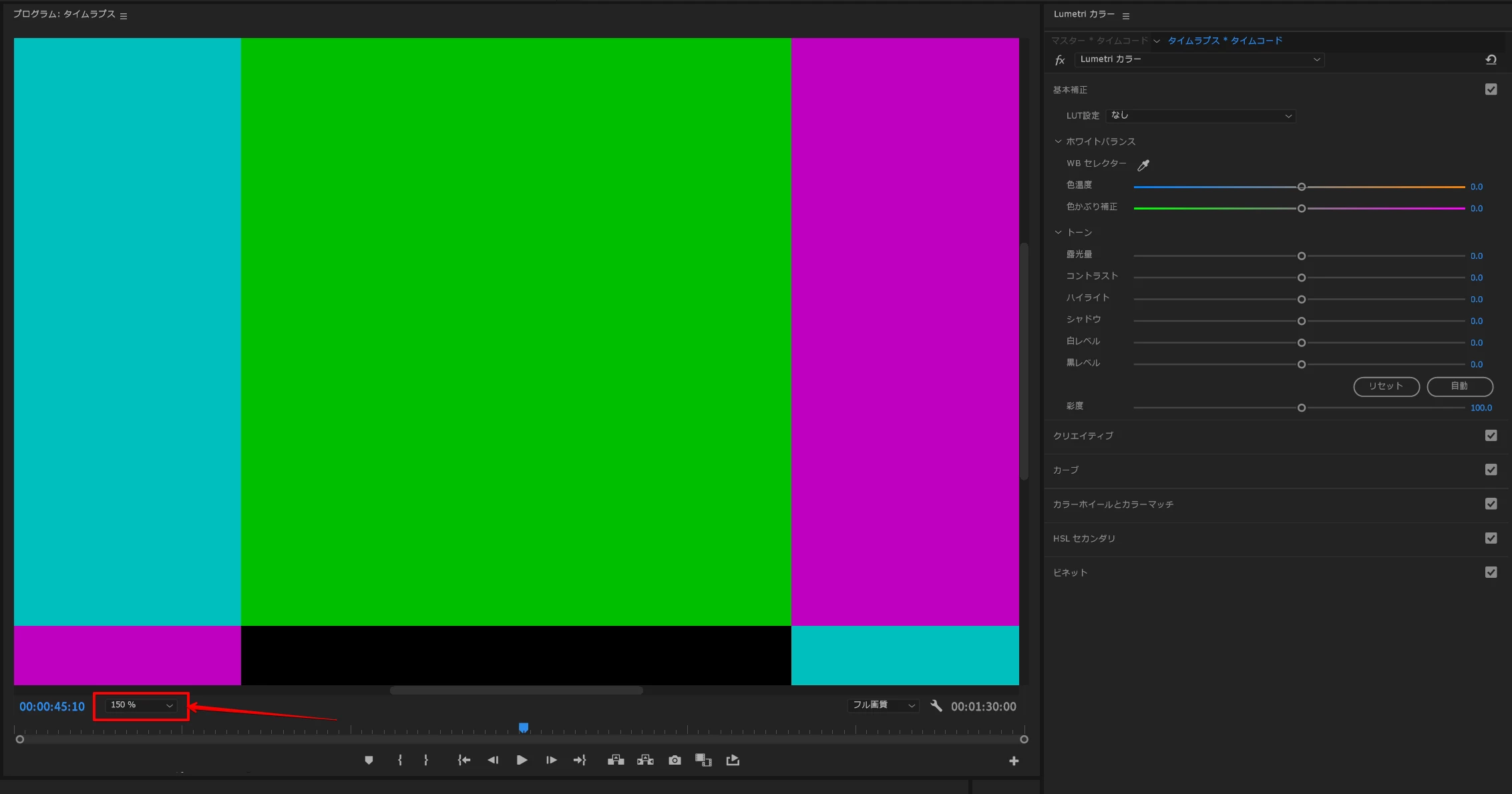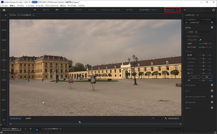 一発で適用できるのが便利なので、LumetriカラーのWBセレクターをよく利用します。