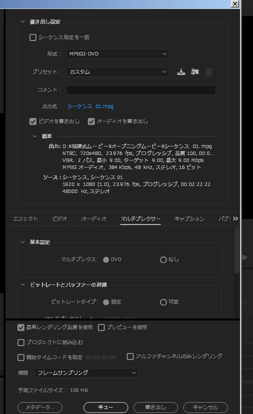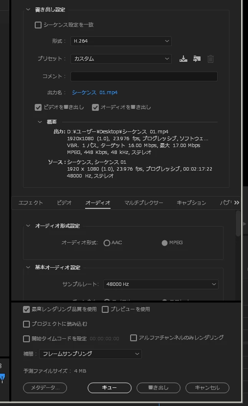 できるだけサウンドのビットレートをあげたいのでMPEGにしたいのですが書き出し設定でおかしいところはありますか?