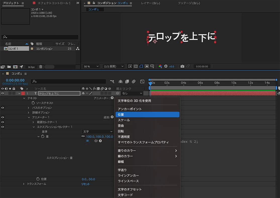 テキストを入力して、「アニメーター」の「位置」を追加します。