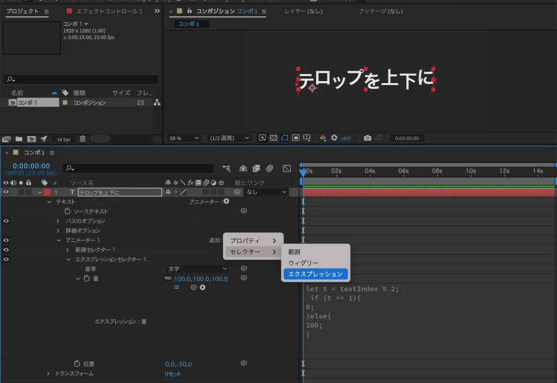 次に、アニメーターの横にある「追加」ボタンで「エクスプレッション」を追加します。