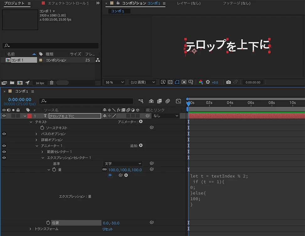 「アニメーター1」の下部にある「位置」の値を変えると、偶数番目の文字が移動します。