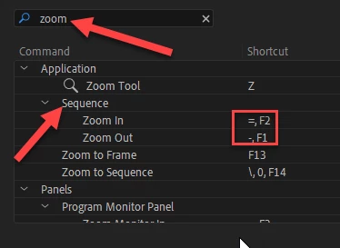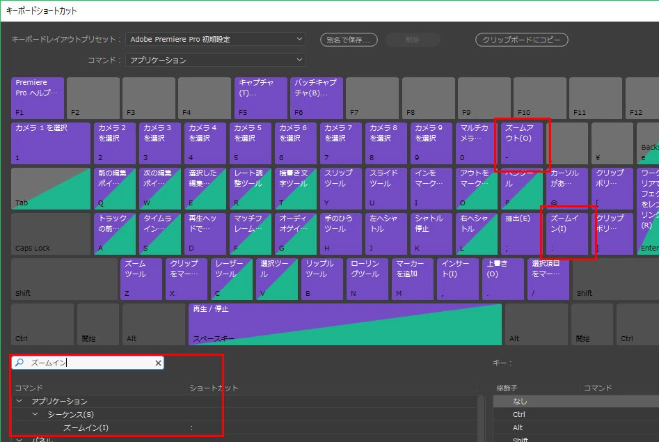 premier proのタイムラインパネル内の下にあるスライダーで拡大縮小ができますよが、そのキーボードショートカットコマンドを教えて下さい。ちなみに私はテンキーのないキーボードを使用しています。