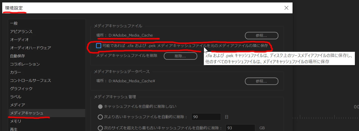 赤丸で囲った部分の設定にチェックが入っていると、素材ファイルと同じフォルダに.pekファイルができます。チェックを外すと、メディアキャッシュファイルの保存場所で指定されているディレクトリに保存されるようになります。