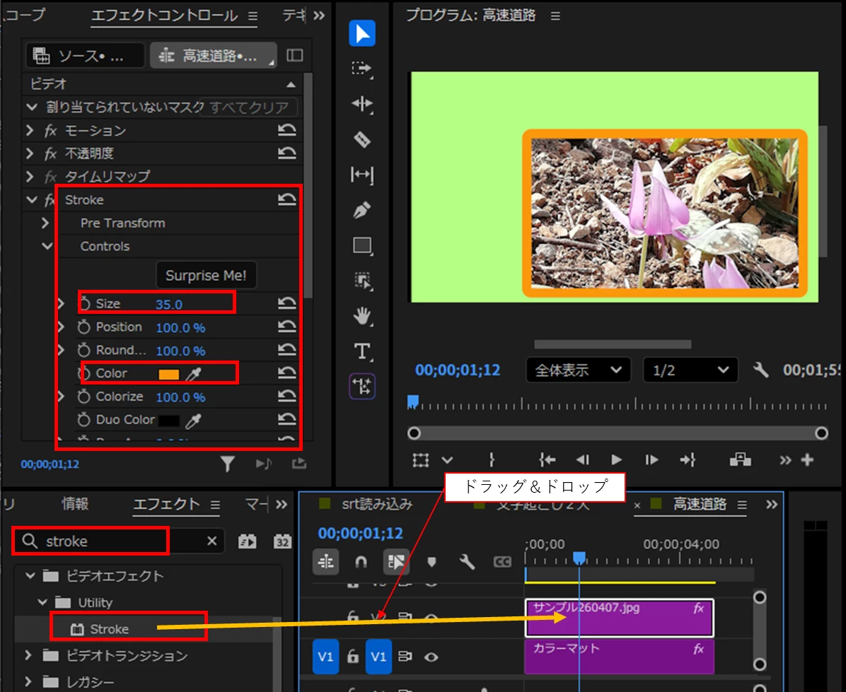 写真クリップを選択したまま。「エフェクトコントロール」パネルを開き、「Stroke」項の「Size」で枠の太さ、「カラー」で枠の色を設定します。