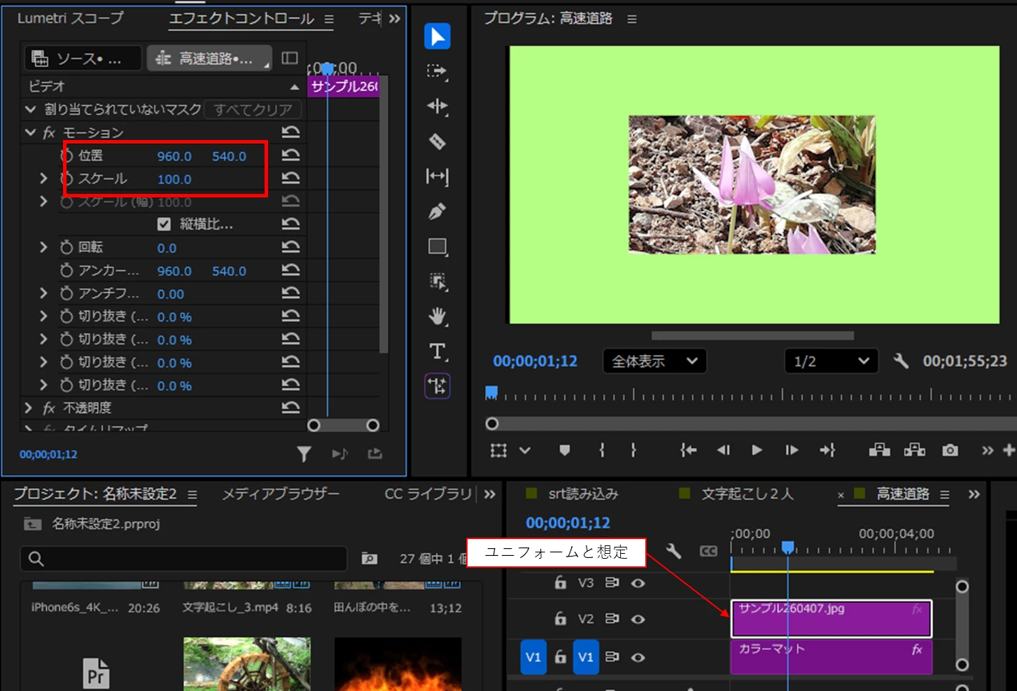 プレミアプロで動画を編集しています。動画に野球のユニフォームの写真を挿入しました。大きさを大きくして、位置も変更して、枠を付けたいのですがどうすればよいでしょうか。