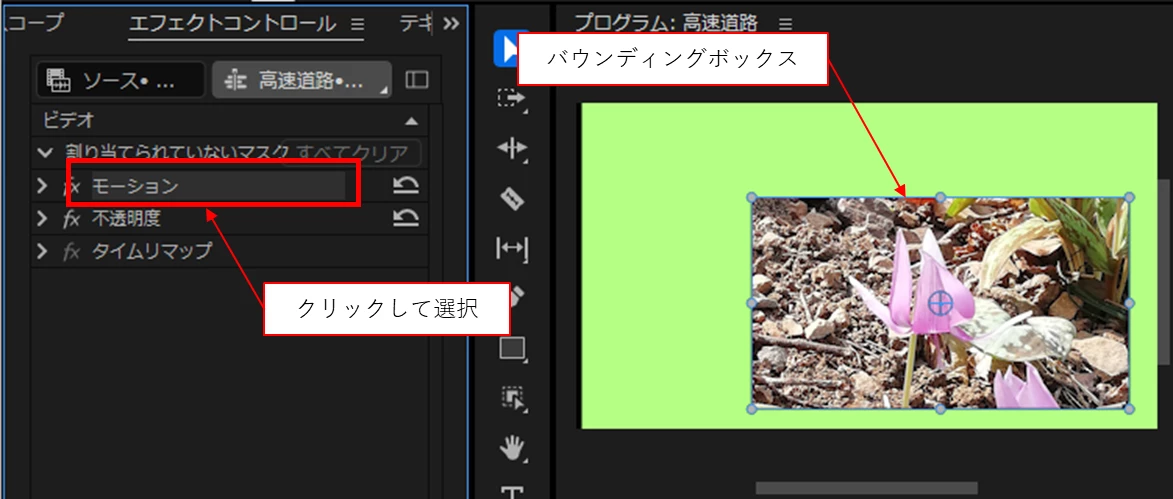 また「モーション」の文字の上でクリックして選択すると、「プログラムモニター」で写真の周囲に青色の「バウンディングボックス」が表示され、周囲の丸いハンドルの上にカーソルを置くと双方向矢印が表示されますので、それをドラッグすると拡大縮小ができます。さらに「バウンディングボックス」内部をドラッグして移動できます。