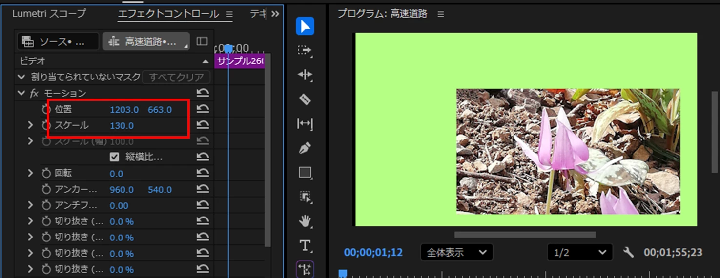 位置変更やサイズ変更は「モーション」の「位置」や「スケール」で行います(下図赤枠部)。