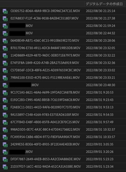 プレミアプロのプロジェクトにある素材をカメラで撮った時系列順に並び替えたいのですがどうしたらいいかわかりません。