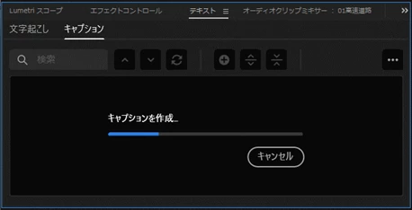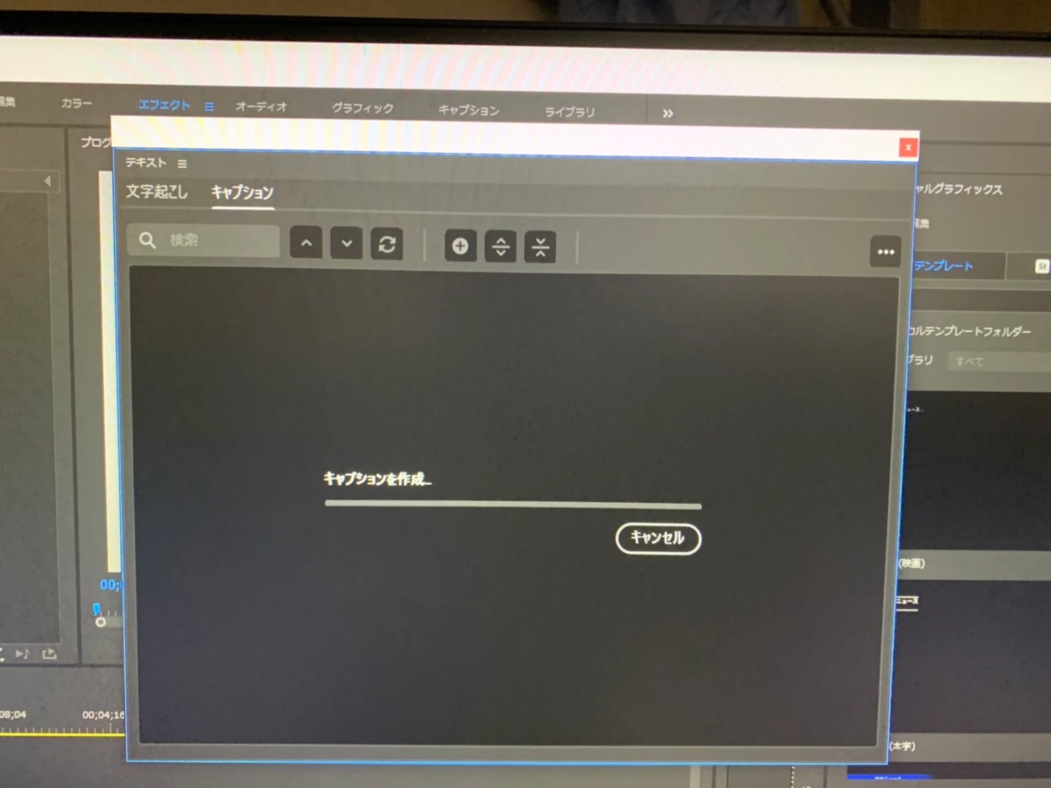 3分程度で文字起こし自体は終了し、タイムラインに反映させるためにキャプションを作成を試みましたが添付の画像のまま動かなくなってしまいました。