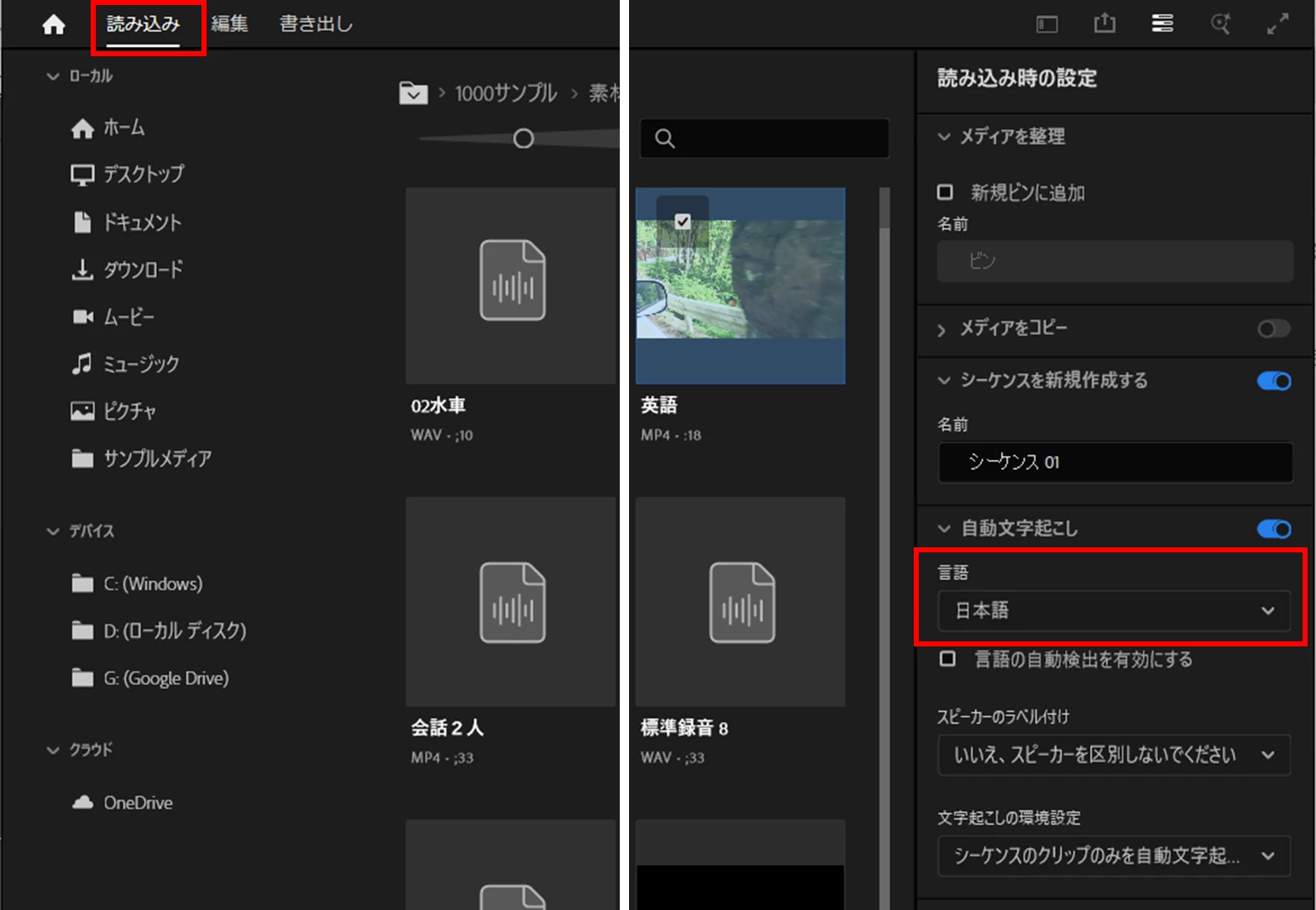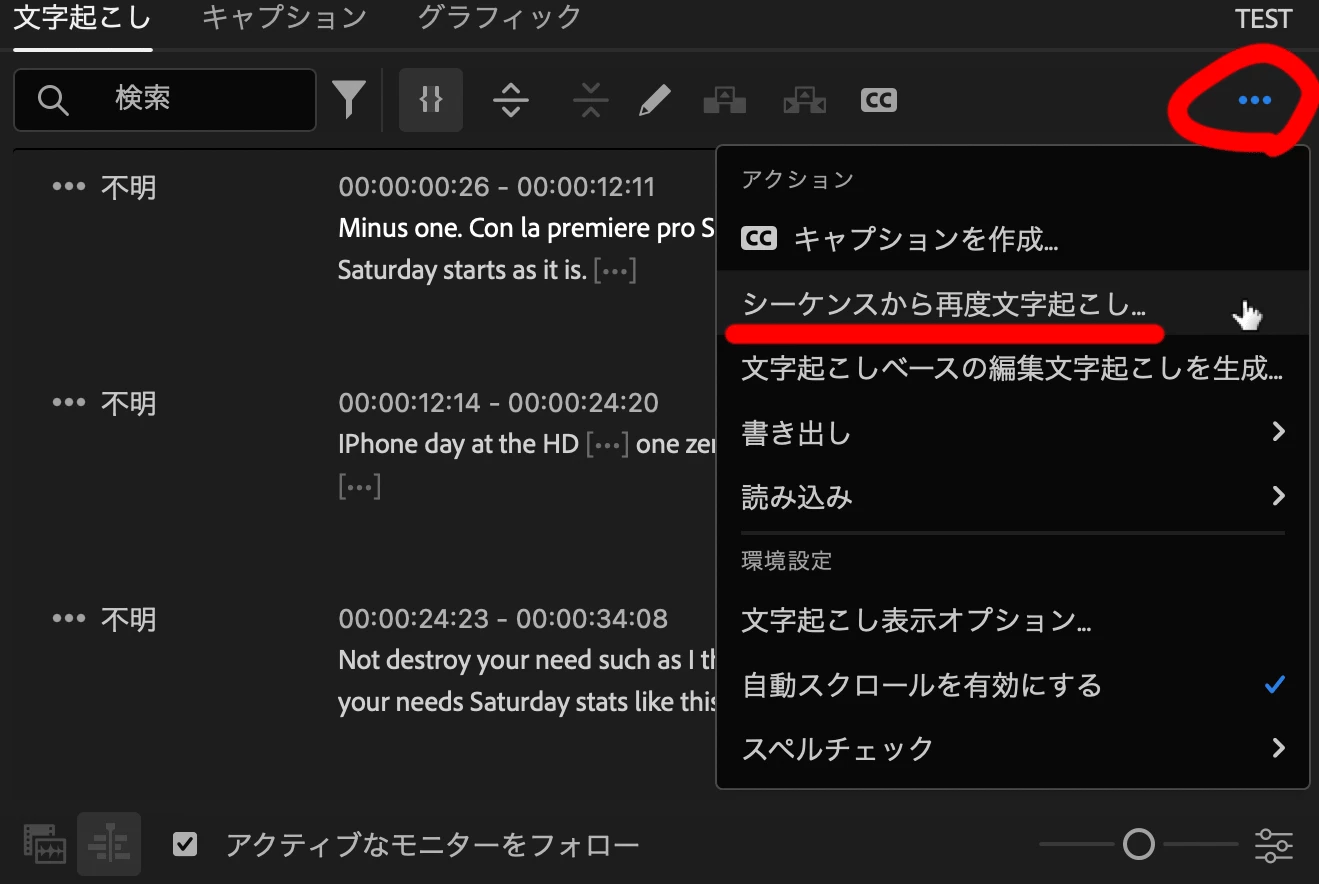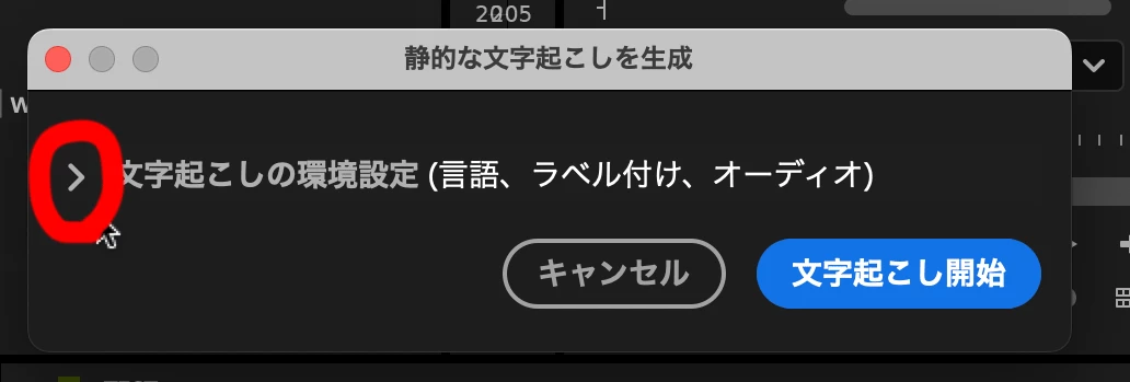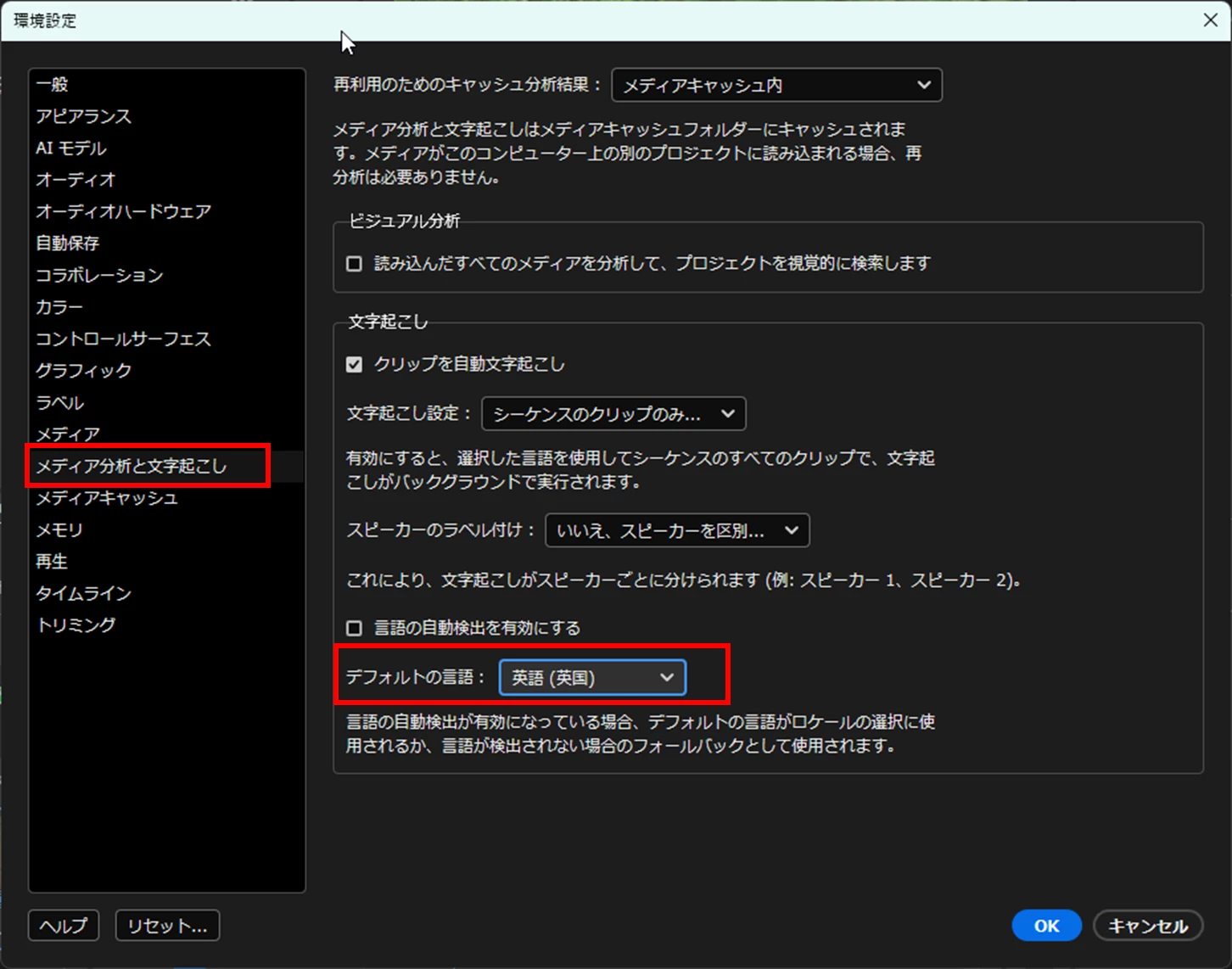 プレミアプロ テキスト 文字起こし 言語設定画面がでてきません。
